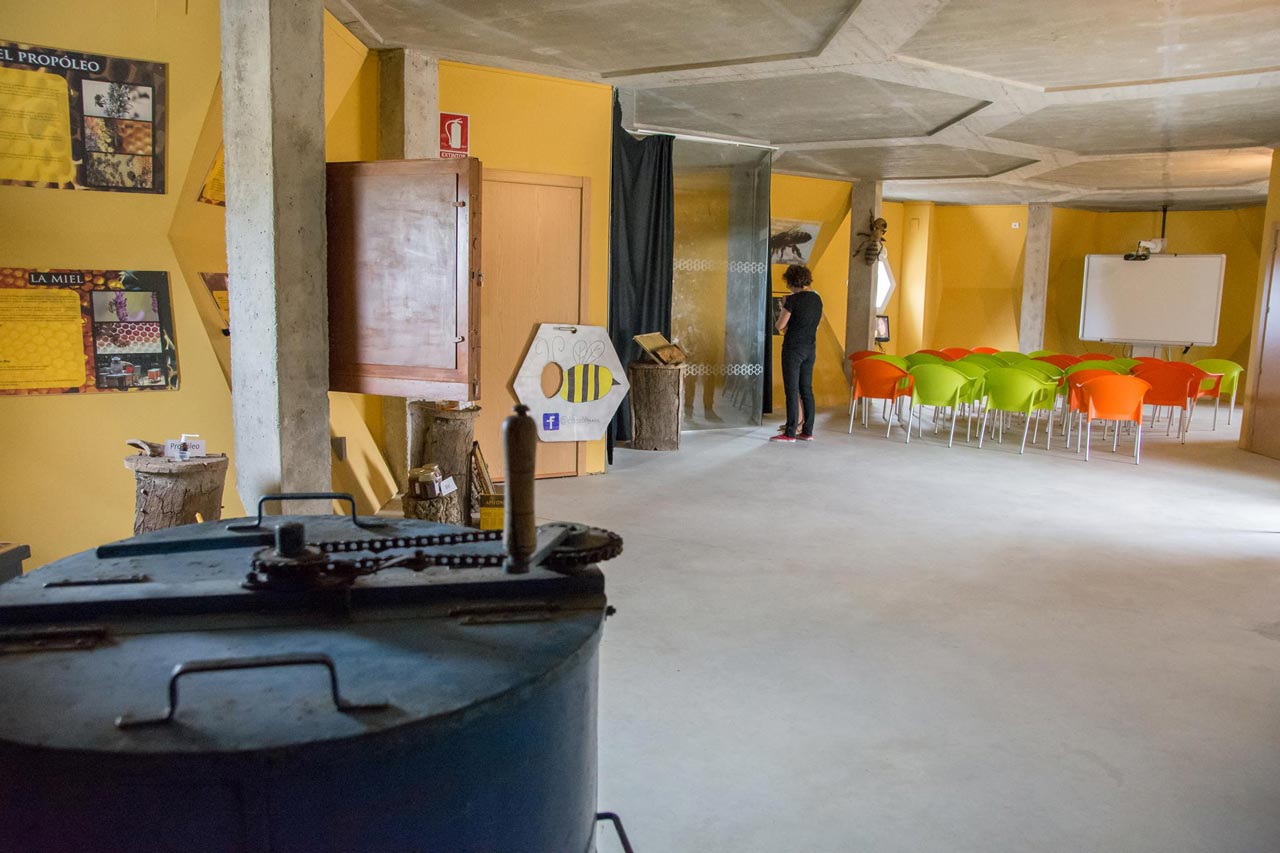 El interior se divide en distintas estancias. Una sala de proyección se encarga de hacer una introducción acerca del mundo de las abejas y su importancia como garantes de la biodiversidad del entorno medioambiental.